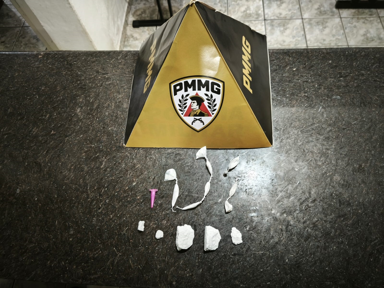 No interior do recipiente foram encontrados nove papelotes de cocaína, um pino da mesma substância e cinco pedras de pasta base utilizada na produção de cocaína. Junto ao material também foi localizada uma certidão de casamento em nome do suspeito.